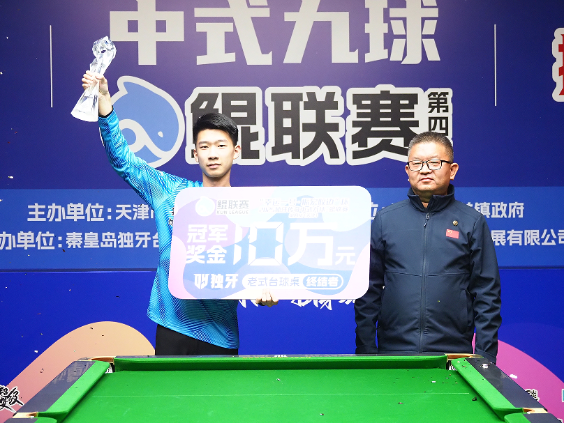 随后进入冠亚季军颁奖环节。周坤和呼冠达获季军,独牙台球运动推广有限公司赛事与球员部总监李雪为他们颁发3万元奖金及荣誉奖盘;何世威获亚军,天津市武清区城关镇经济发展办主任郝长健为其颁发5万元奖金及荣誉奖盘;陈成汉在众多参赛选手中脱颖而出,成功问鼎本站赛事冠军,天津市武清区体育局局长张迎新共同为其颁发10万元奖金及冠军奖杯。